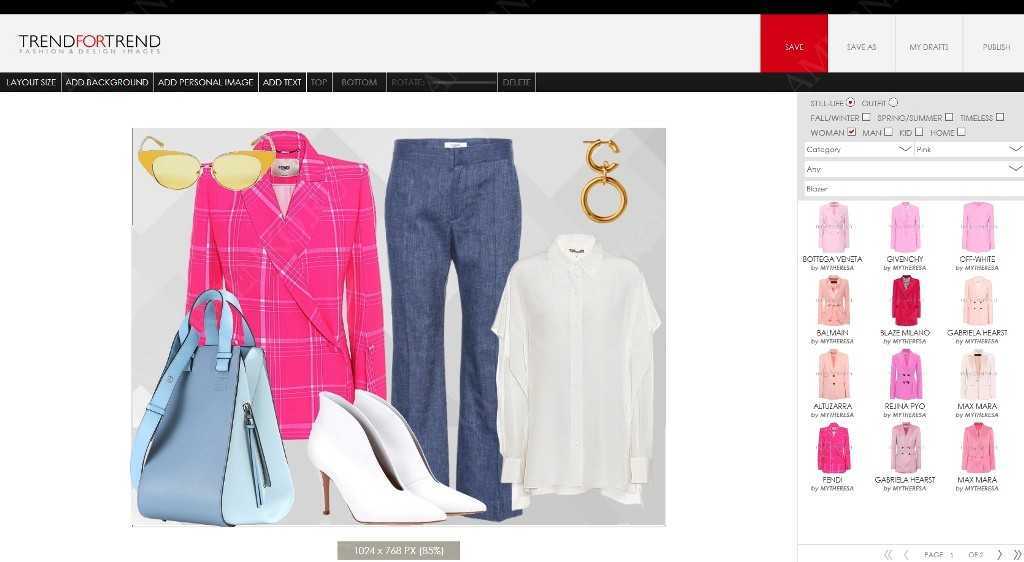 Справа от редактора находятся разные категории: товары для женщин, товары для мужчин, товары для детей, товары для дома. Все изображения можно отфильтровать по сезону, в котором были представлены коллекции, по типу (одежда, обувь, сумки, аксессуары и т.п.), по цветам, по брендам. Можно задать определённые теги для поиска. База изображений сравнительно небольшая – всего их около 16000, но она постоянно растёт.