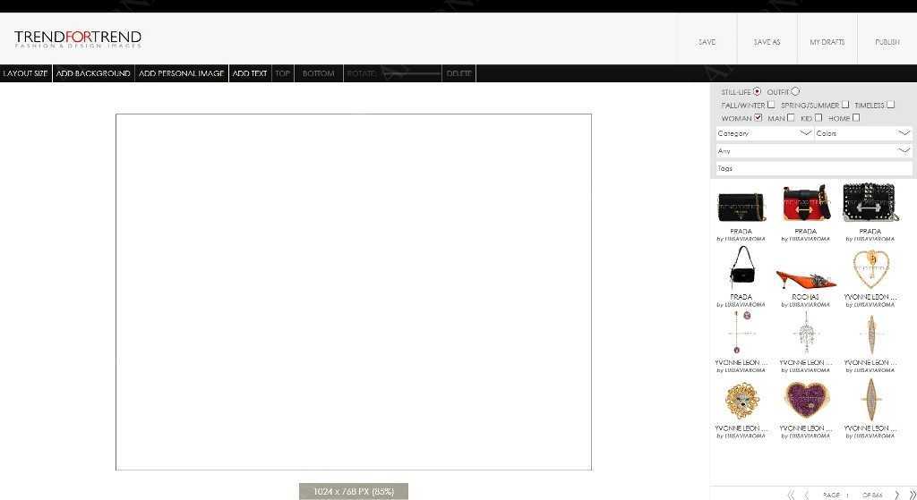 Для того, чтобы начать работу в TrendForTrend, пройдите простую процедуру регистрации. Затем перейдите во вкладку «Create» (Создать) и откроется редактор для составления коллажей. Сверху над редактором отображаются функции «Layout size» (размер коллажа), «Add background» (добавить фон), «Add personal image» (добавить собственное изображение), «Add text» (добавить текст), «Top» (передний план), «Bottom» (задний план), «Rotate» (вращение), «Delete» (удалить). Добавление фона, текста и собственных графических изображений возможно только после того, как вы сохраните макет коллажа (Save или Save as справа вверху).