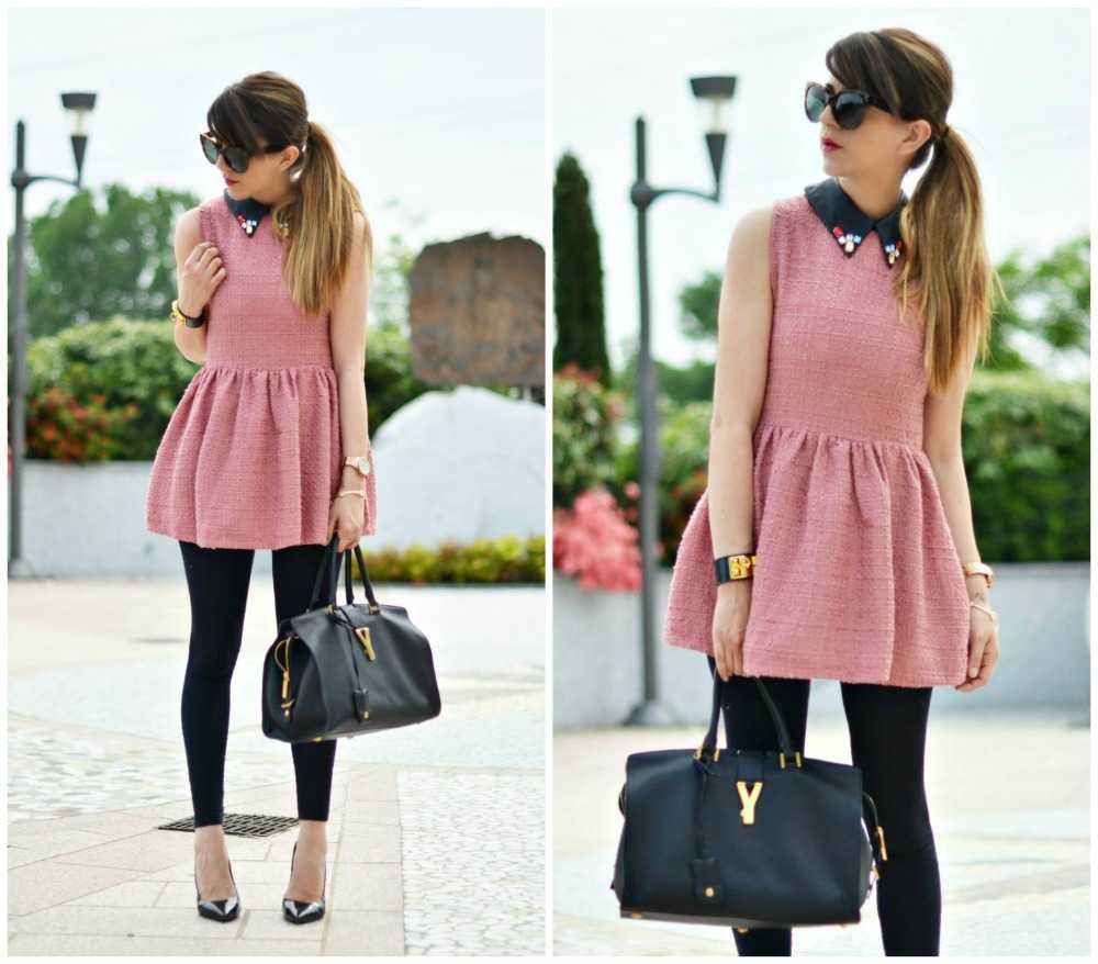 Если вы не решаетесь надеть ультракороткое розовое платьице, используйте его в тандеме с черными лосинами и классическими туфлями-лодочками. Скромный образ разбавляют металлические элементы на браслете и сумочке.