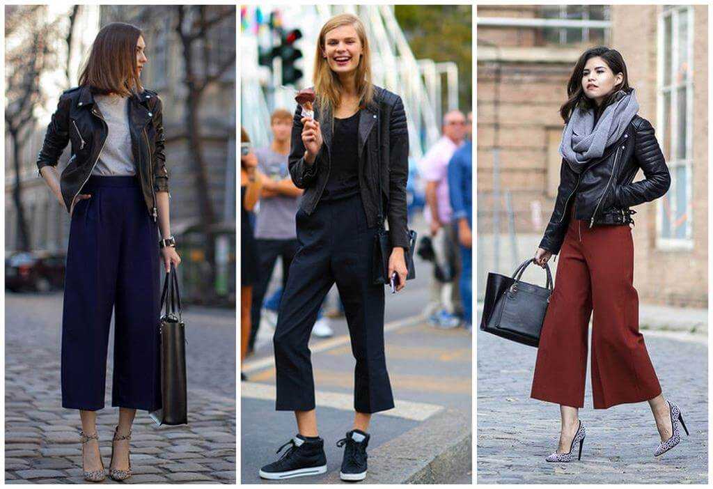 Черная кожаная косуха отлично сочетается с брюками из плотной ткани, несколько свободными. Клетчатые модели в мужском стиле и чиносы следует дополнить обувью на плоской подошве (лоферами, брогами). Классические или широкие брюки и косуху можно сочетать с лодочками, но образ следует дополнить женственными аксессуарами (небольшой прямоугольной сумкой, легким шарфиком).