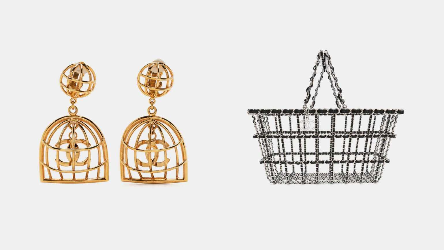 Лагерфельд привнёс в кутюрный Chanel юмор. Слева серьги в виде птичьих клеток, справа сумка в виде корзины для покупок: византийское золото и цепи — это одни из основных визуальных кодов домаФото: Farfetch / Farfetch