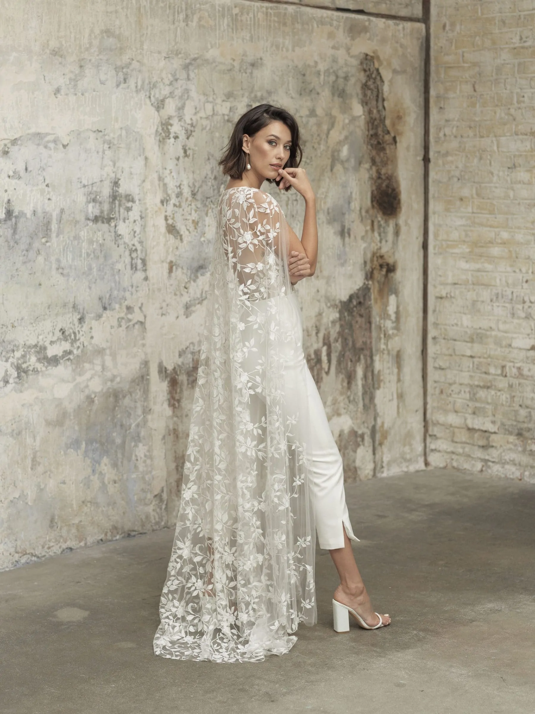 Для новобрачной, которая не боится экспериментов и хочет заявить о себе, отличным вариантом будет атласный комбинезон с кейпом. Накидка добавляет образу элегантности и изысканности, что делает ее удачной идеей для официальной церемонии.