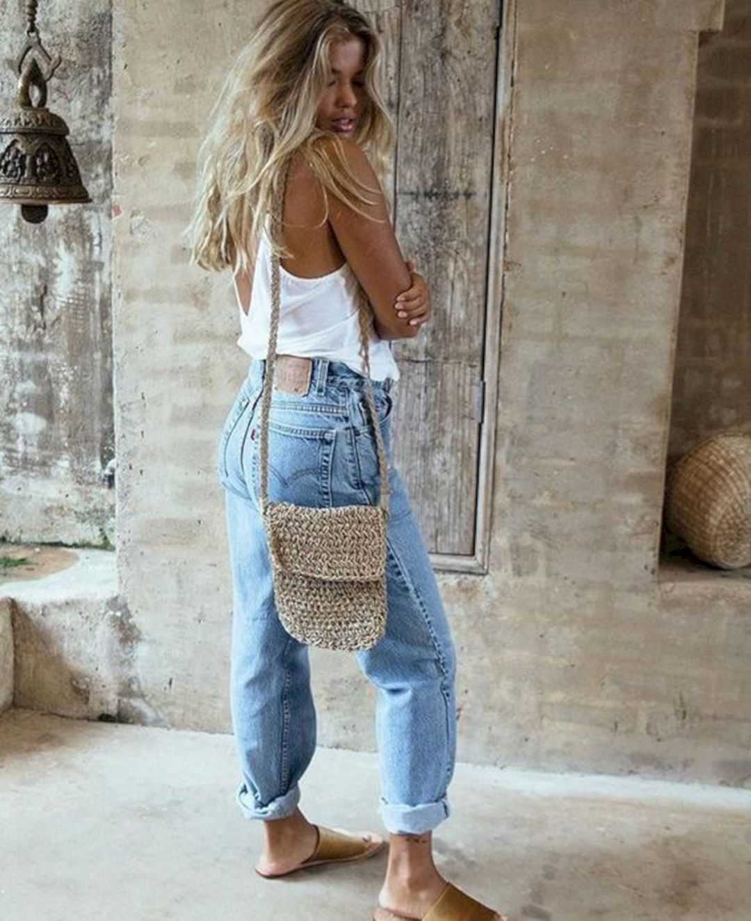 Прежде всего, нужно обращать внимание на материал – они должны быть контрастными. В летнее время самым удачным сочетанием с джинсами мом станет легкий топ из шелка