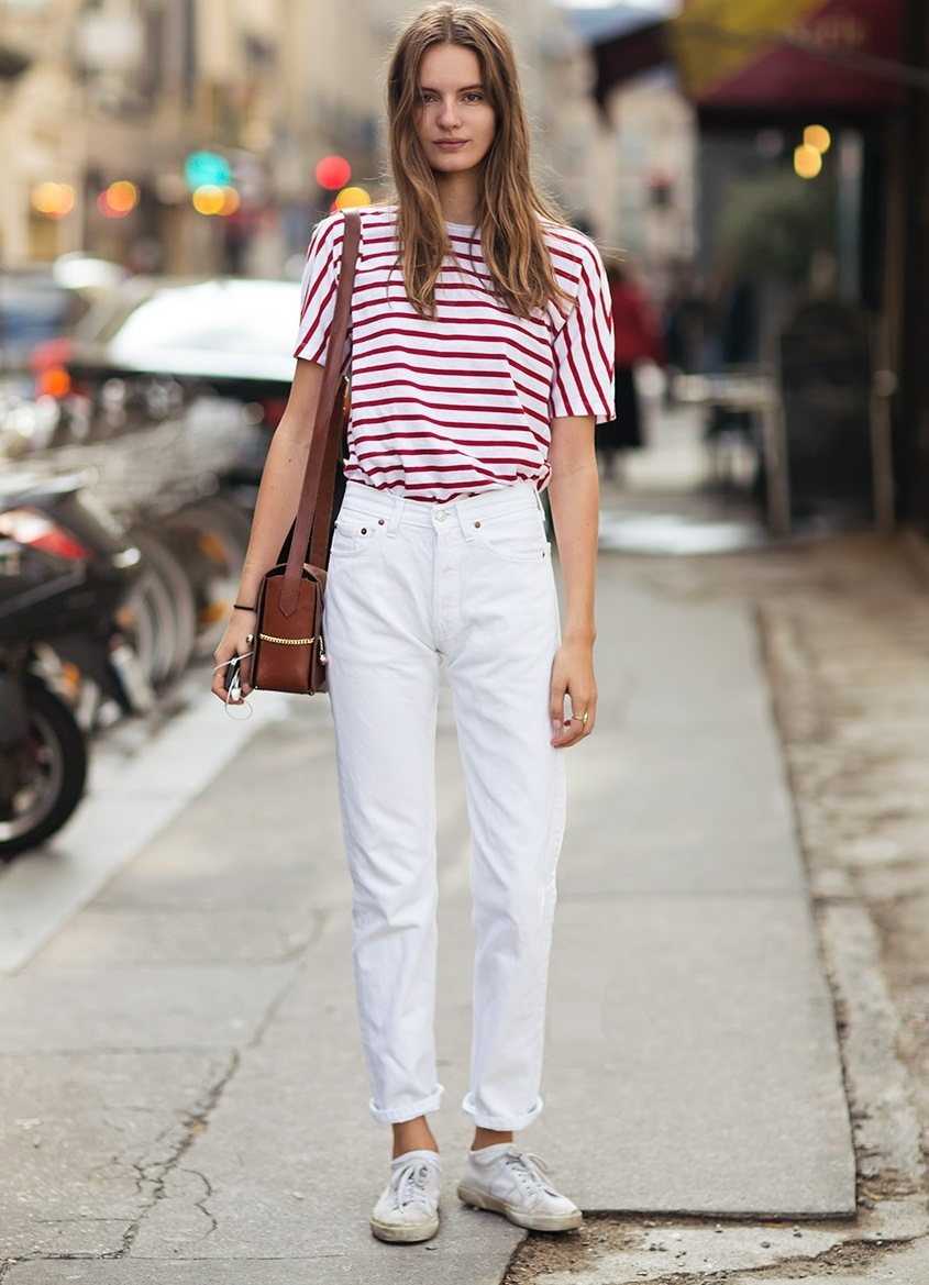 Одним из самых удачных вариантов считается сочетание приталенных джинсов с белой футболкой. Это подходящая комбинация для теплого времени. Она выглядит ненавязчиво. В джинсах мамсах, дополненных футболкой, можно путешествовать, проводить время на природе.