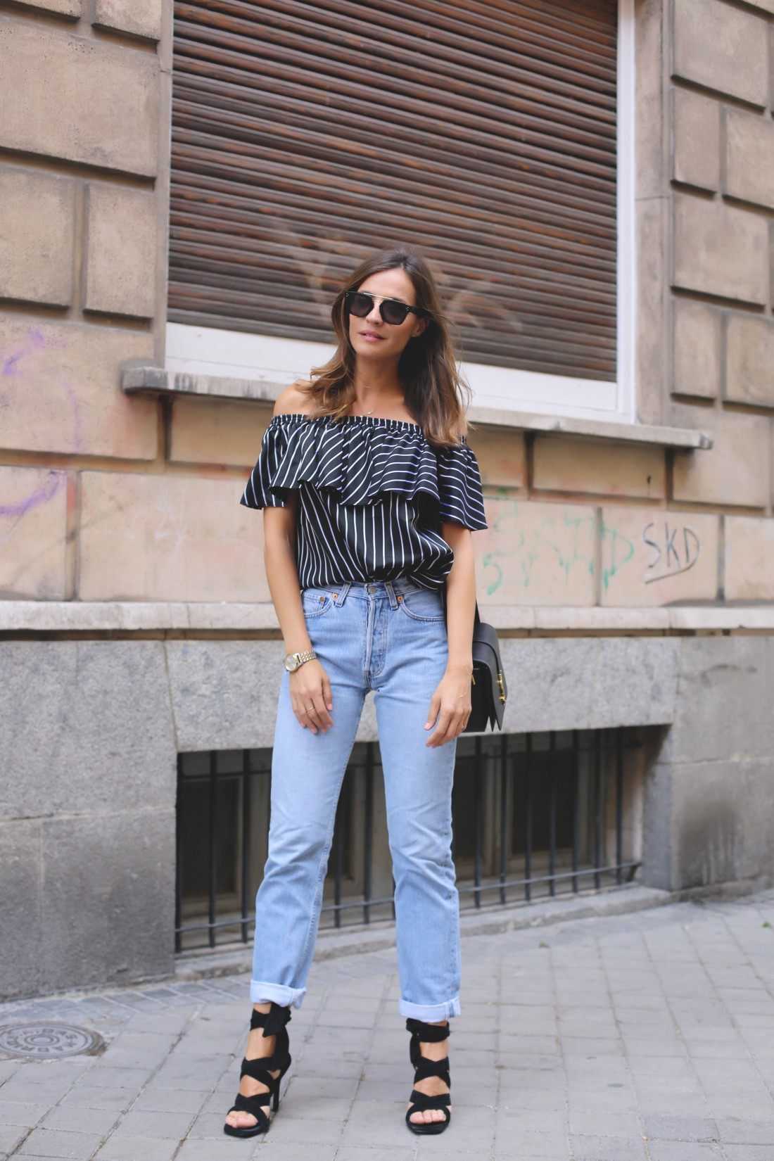 Очень круто грубоватые джинсы гармонируют с топами на бретелях из атласной и кружевной ткани. Правда, такой комплект часто нуждается в дополнении — иногда нужно прикрыть плечи кардиганом или плащом. Чтобы уравновесить баланс, рекомендуется выбирать обувь под стать топу — туфли или босоножки на каблуке.