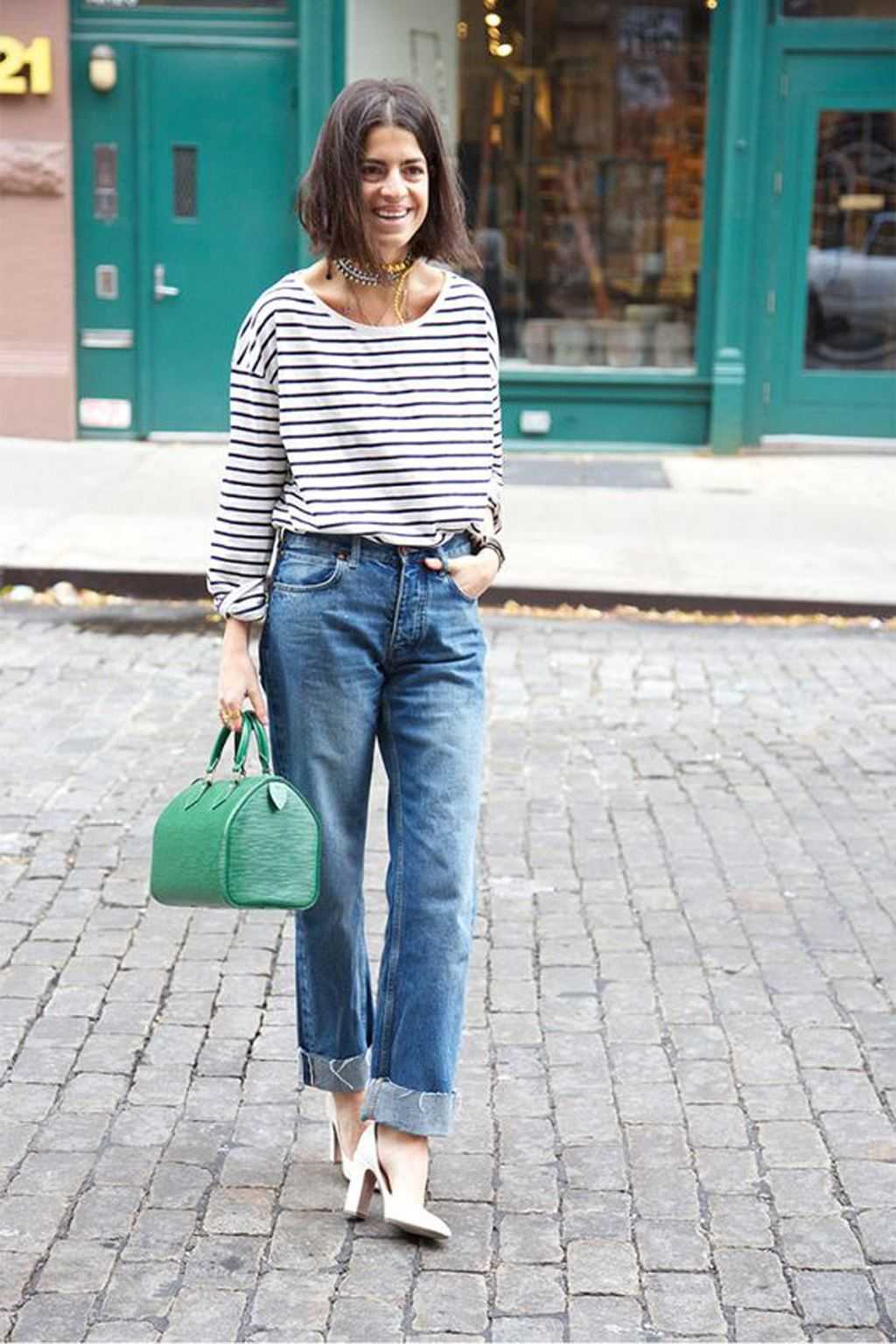 Лодочки на каблуке и джинсы-мом – совместимые вещи. При завышенной талии ноги приобретают дополнительную длину. Этот факт стоит взять на заметку невысоким женщинам.