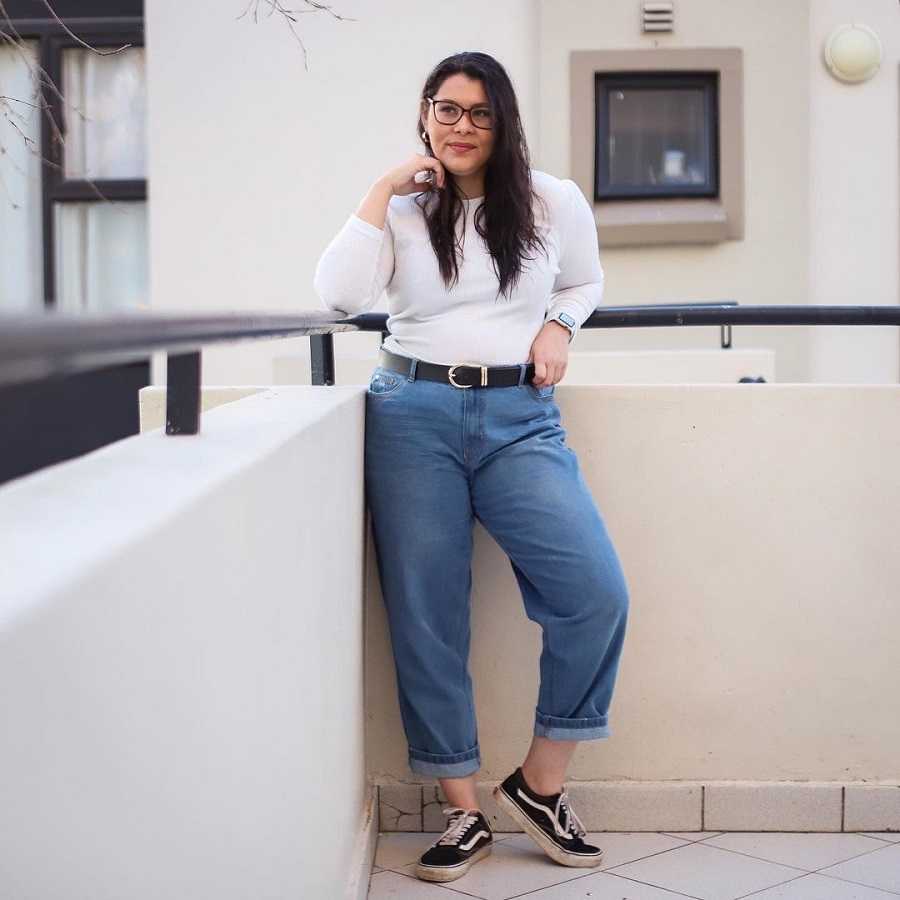 Любительницы минимализма могут отдать свое предпочтение следующему эффектному и достаточно простому в исполнении образу, который включает в себя: светлую водолазку, джинсы мом, кожаный контрастный ремень, а также черно-белые кеды.