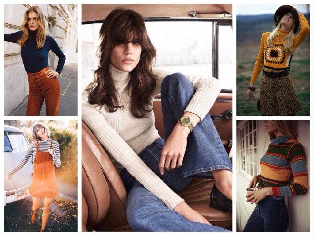 Культовой вещью в это время становится тонкий свитер, дополненный воротником-стойкой, который известен, как водолазка. Их надевали под платья и рубашки, комбинировали с костюмами, брюками, сарафанами, комбинезонами, юбками. в 70-х стала невероятно популярной и удачно вписалась в популярный тогда этнический стиль.