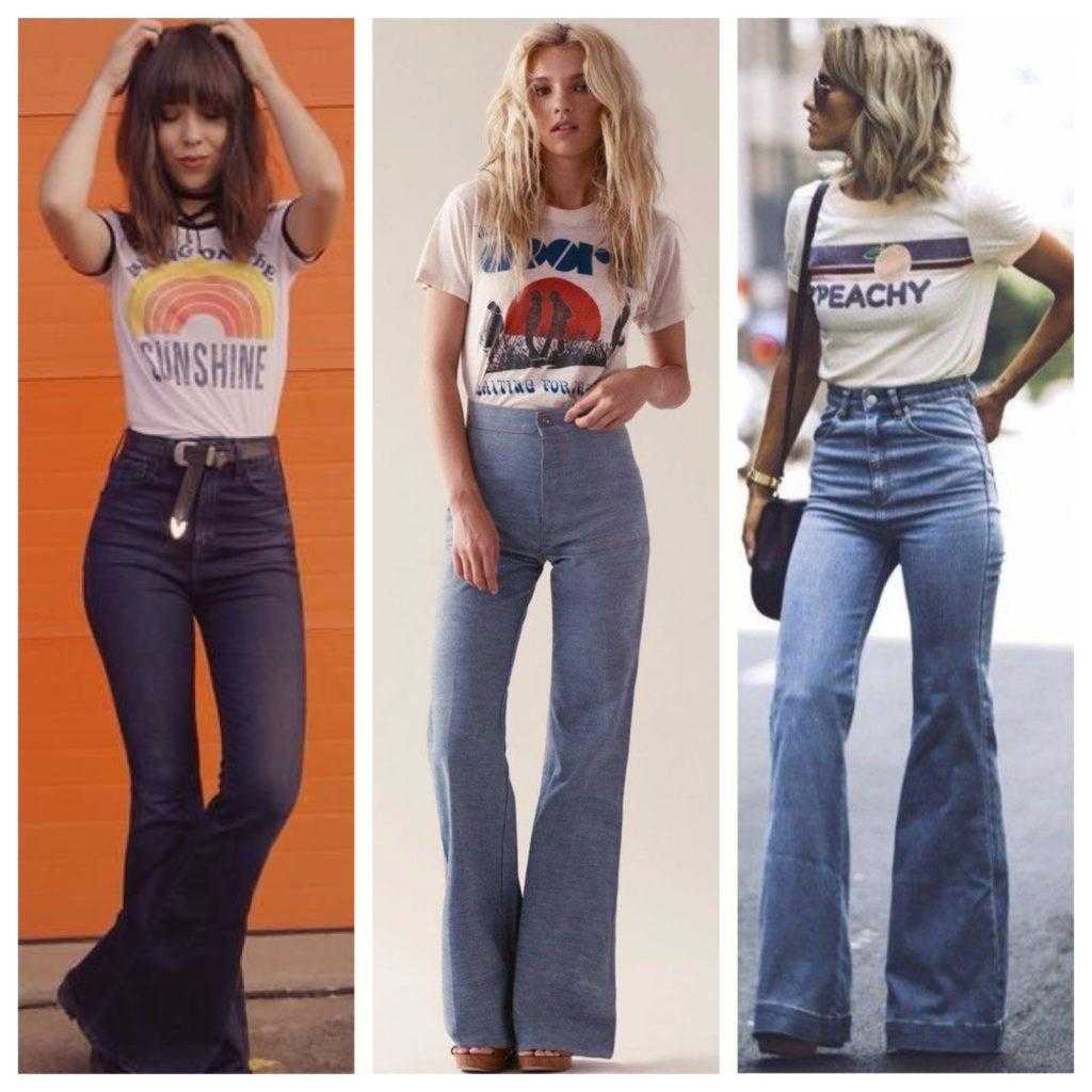 Периодически были модны клеш, который начинался от колена, уровня бедра, супер-клеш по всей длине и только в конце 70-х популярными становятся узкие брюки, как на фото.