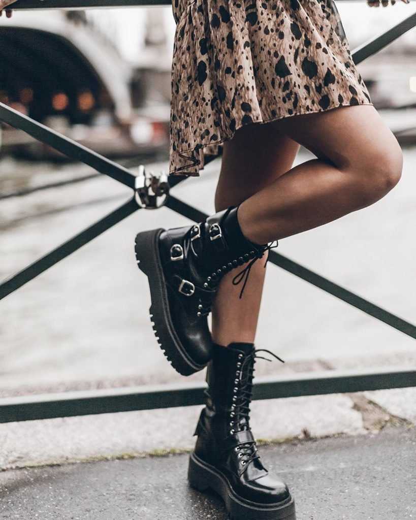 Ботинки на платформе могут быть выполнены из различных материалов и иметь разные дизайны. Например, это могут быть черные кожаные ботинки на массивной платформе с замшевыми вставками, что создаст интересный контраст. Также популярны модели с узорами: змеиная кожа, зебра или леопардовый принт. В дизайне использованы яркие цвета или сочетание нескольких оттенков.