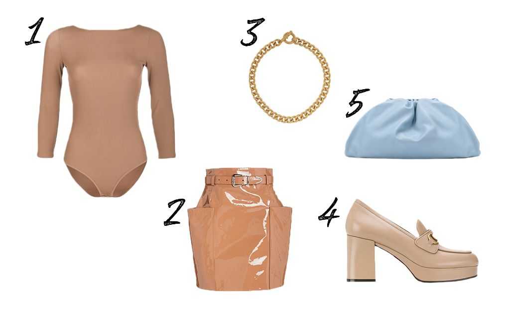 1 – боди Love Republic, 2 – юбка Lapointe, 3 – колье-цепь Christian Dior, 4 – лоферы на каблуке Gucci, 5 – сумка Bottega Veneta