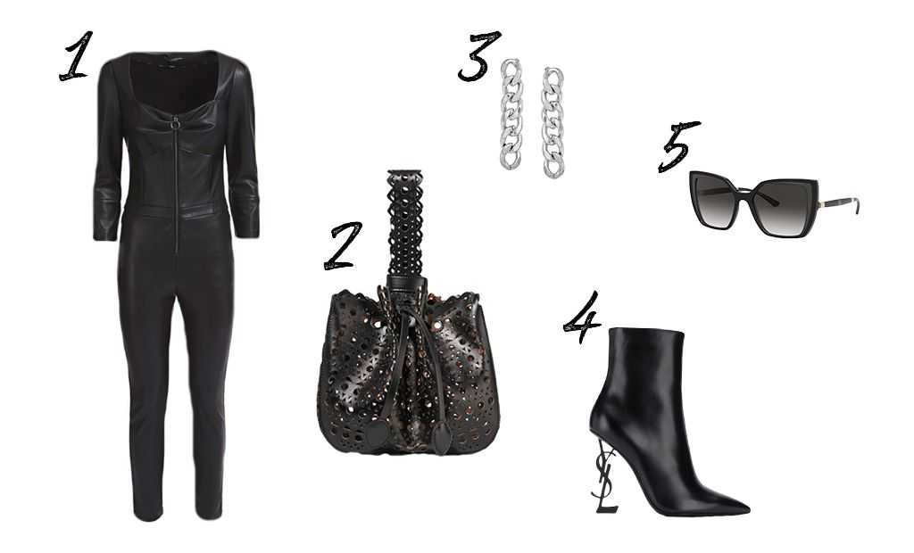 1 – комбинезон Guess, 2 – сумка Alaia, 3 – серьги Aqua, 4 – ботильоны Saint Laurent, 5 – солнцезащитные очки Dolce & Gabbana