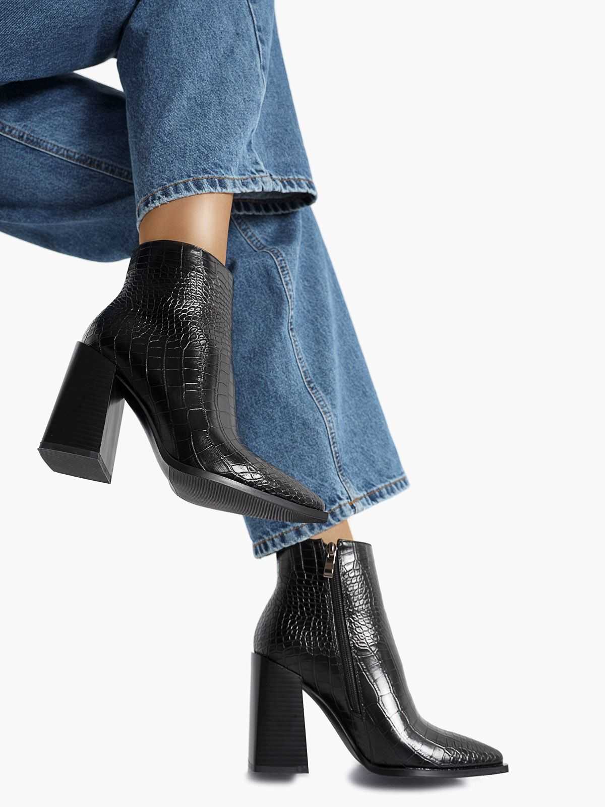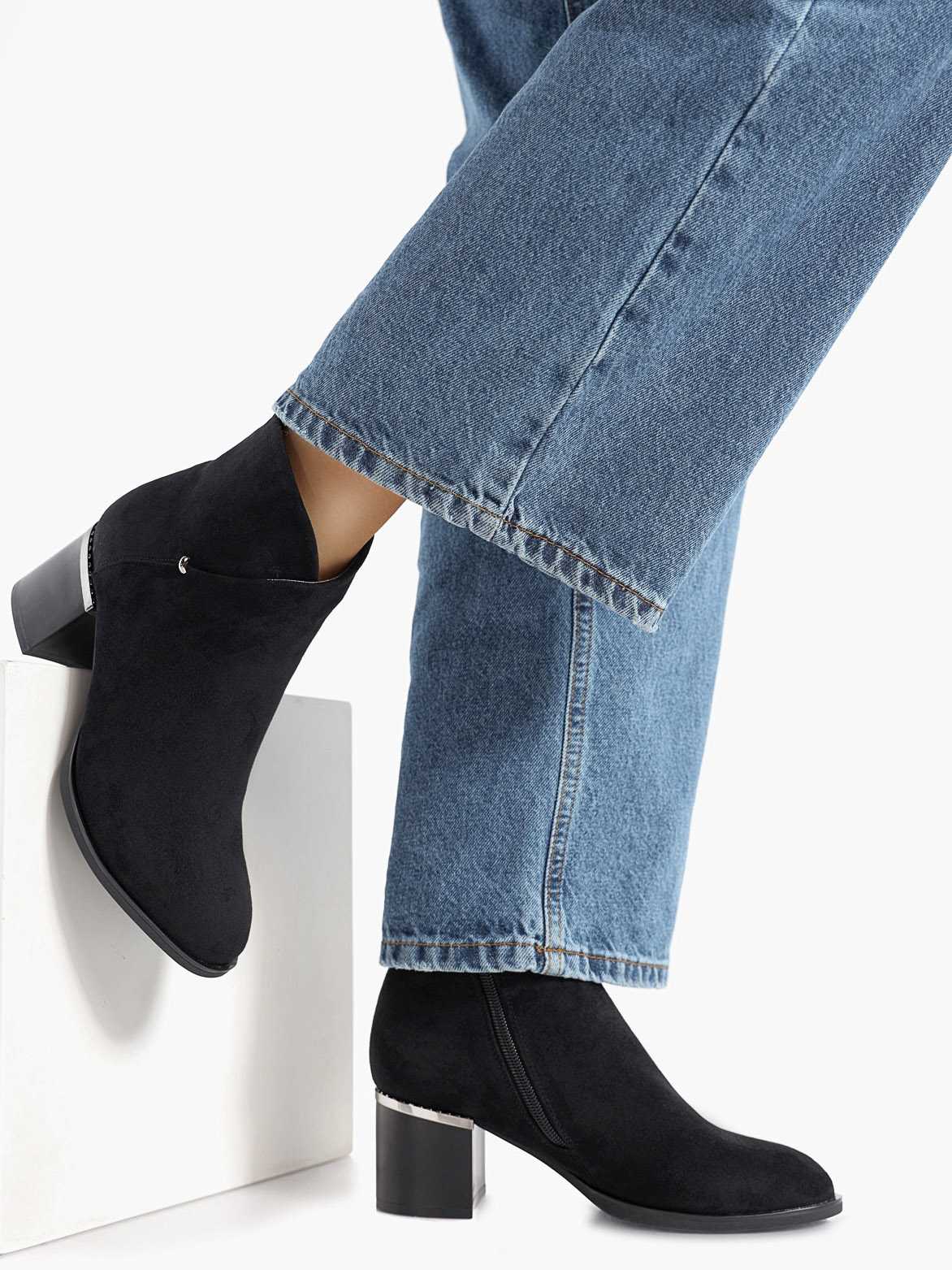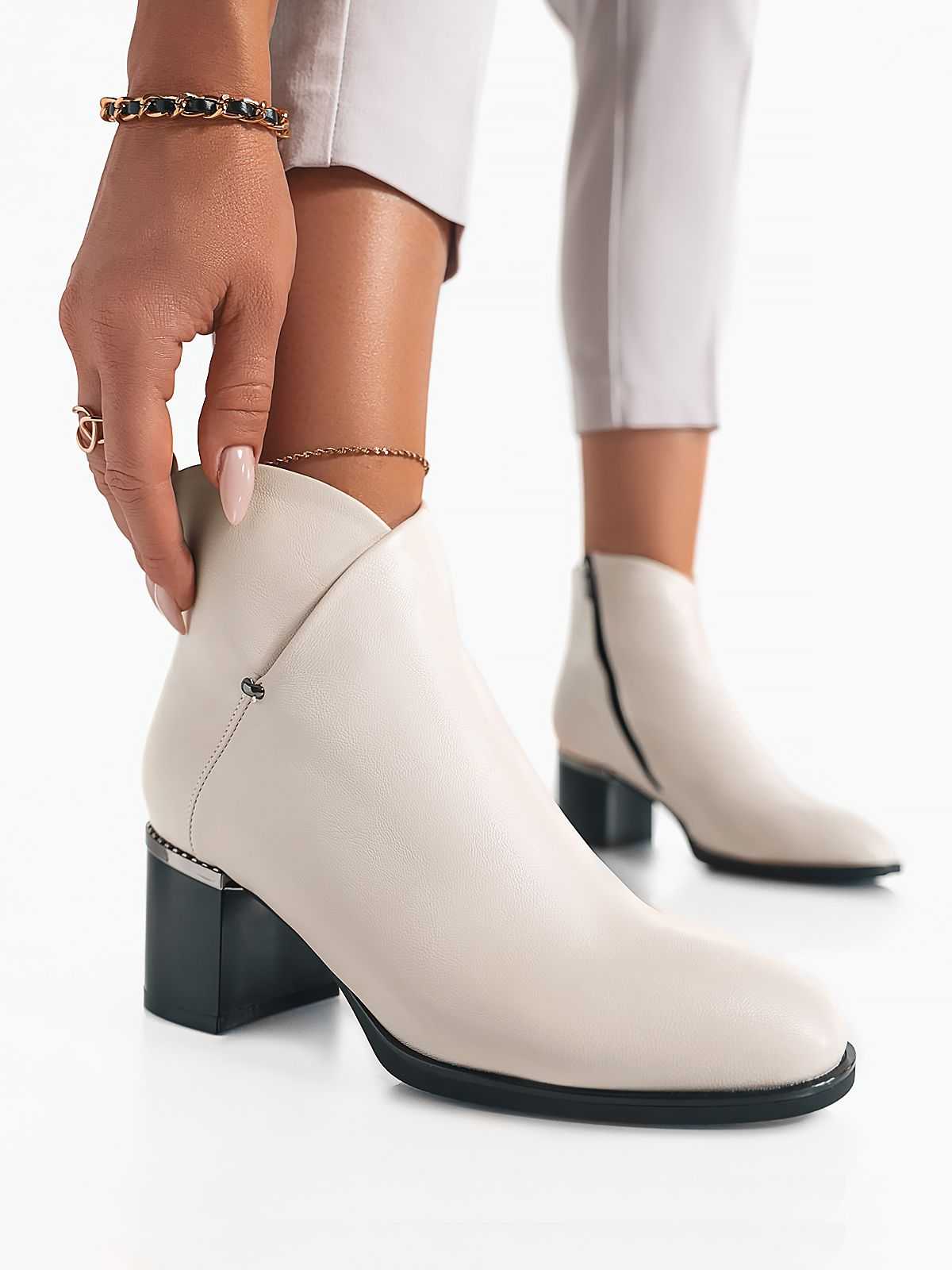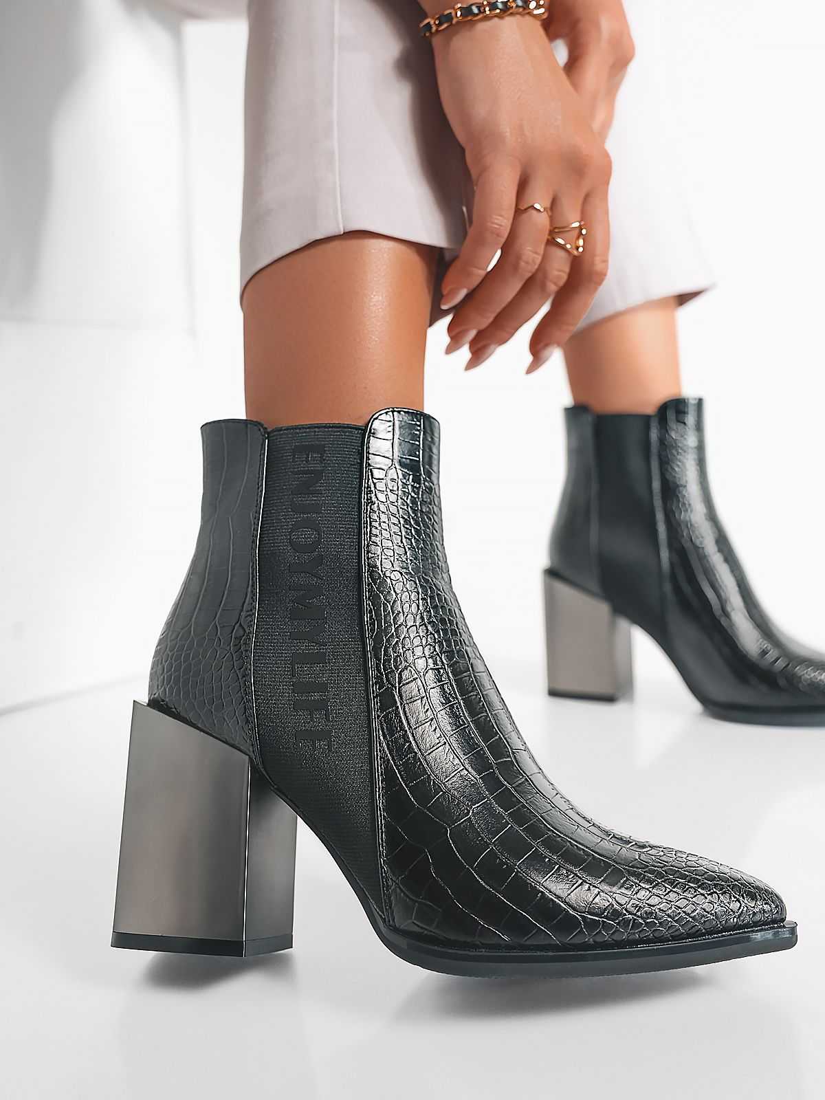 - По высоте и форме каблука. Ботильоны на шпильке выглядят очень изящно, элегантно. Более устойчивый каблучок «рюмка» подойдет для повседневного образа. Толстый каблук обычно дополняет устойчивую, нескользящую подошву – это отличное решение для зимы или непогоды. Квадратный элемент придаст рост, сделает обладательницу визуально стройнее.