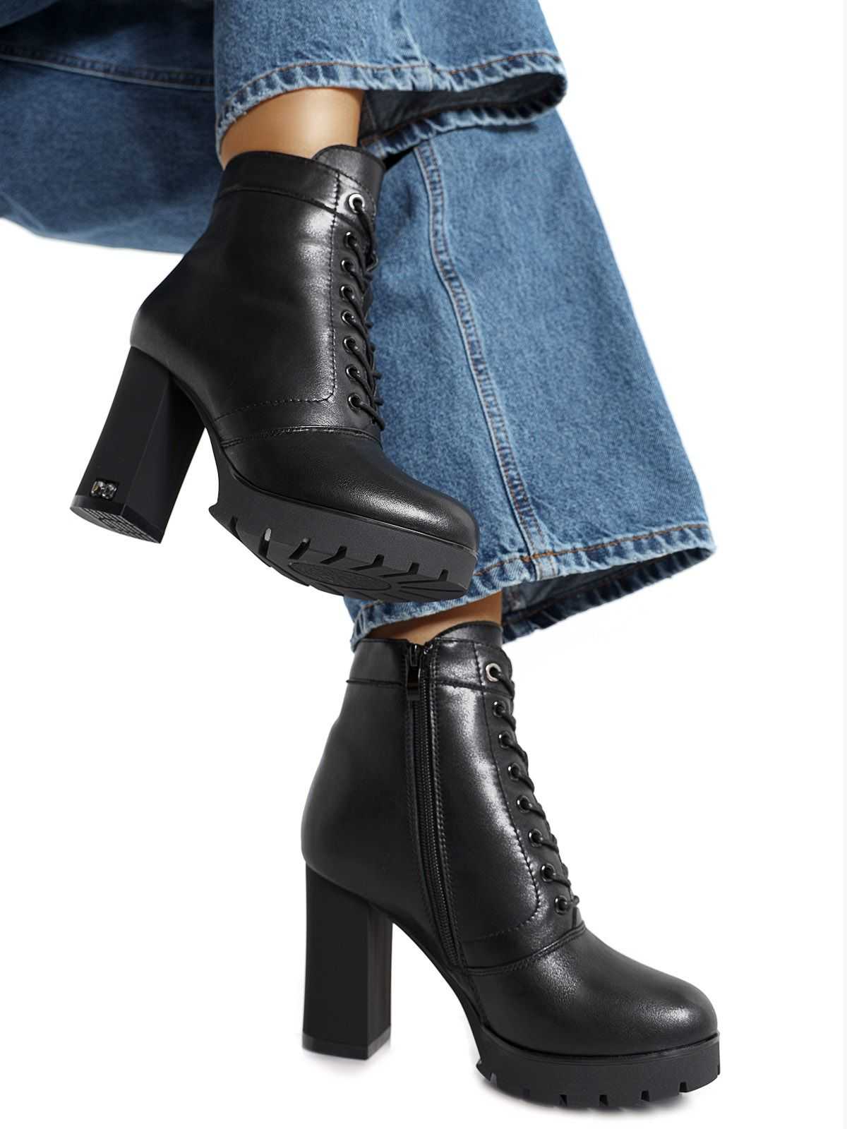 На толстом устойчивом каблуке. Ещё одна разновидность ботильонов, которая пользуется неимоверной популярностью. Всё потому, что они плотно облегают ногу, не утяжеляют образ и зрительно стройнят. В качестве застежки здесь может использоваться молния, шнуровка, небольшие пуговки или заклепки.