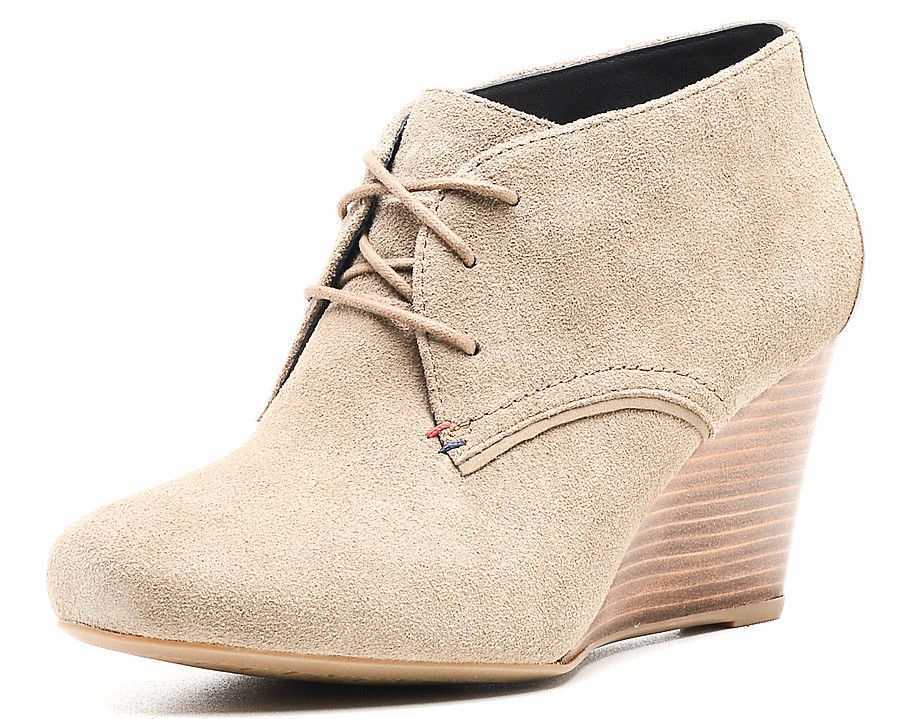 На танкетке. Один из самых носибельных вариантов среди девушек. Ведь танкетка позволяет быть на высоте, но при этом не создает дискомфорт. К тому же, ботильоны на танкетке считаются весьма универсальными видом обуви, так как носить их можно практически со всеми вещами из базового гардероба.