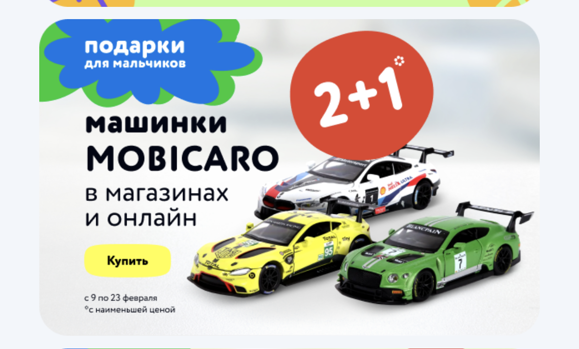 Рассылка от Детского мира на 23 февраля с подборкой товаров со скидкой для мальчиков. Нейтрально, но зеленый и желтый цвета напоминают о милитари теме.