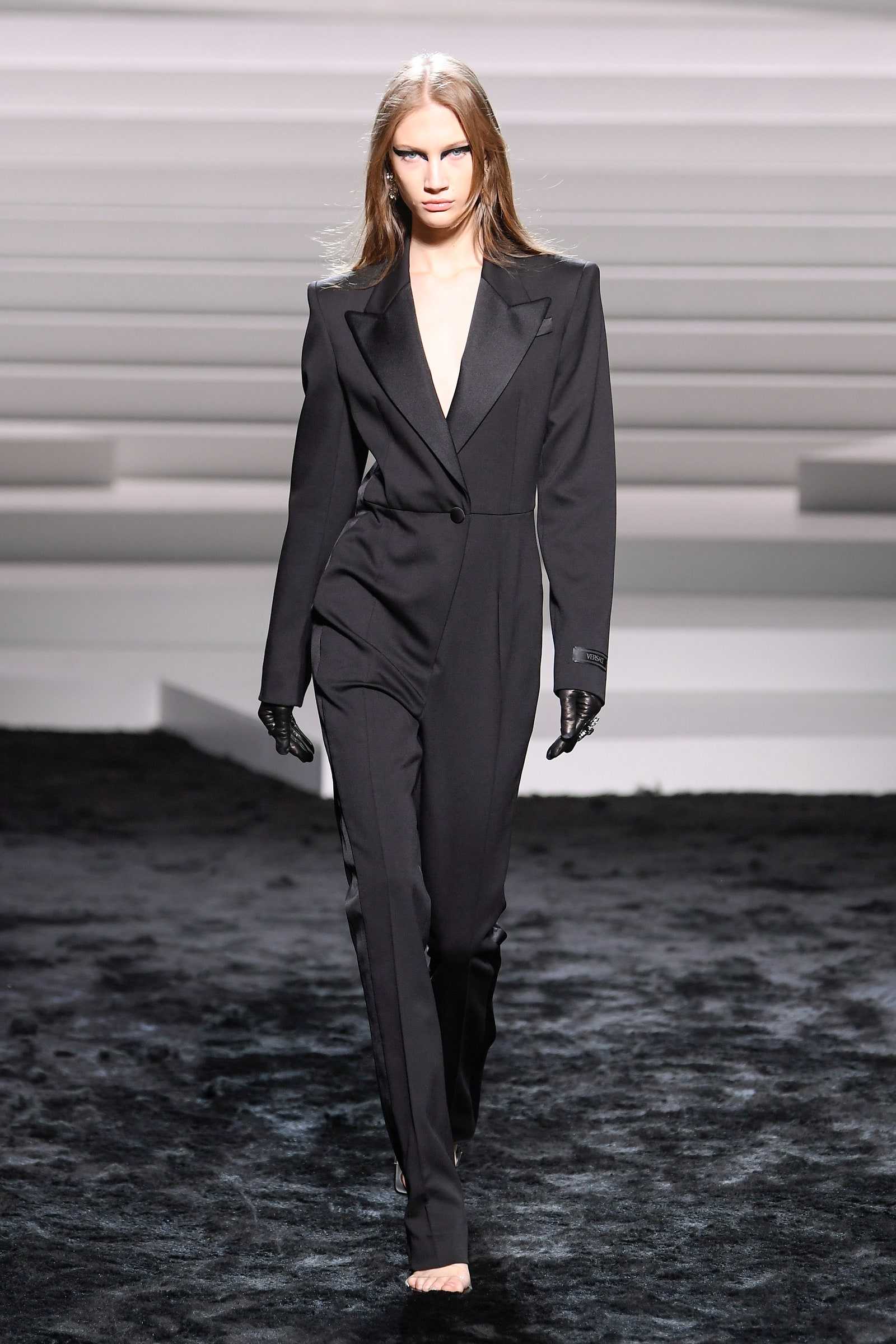 «This collection has a rebel attitude and a kind heart. The woman is a good girl with a wild soul. She is prim but sexy,» said Donatella Versace. «Don’t mess with her! The man is her soulmate, a shy genius. They are breaking the rules to make new ones. The clothes take the codes of contemporary formal tailoring and disrupt them with cut, drape, and embellishment. The collection focuses on pure lines, innovative fabrics, considered wildness. This is us. This is Versace!” Two different takes on this rebellion stood out in particular. Firstly, there was the tailoring that had been stripped back from its strictness. Secondly, there were the sexiest and most famous dresses on the planet.