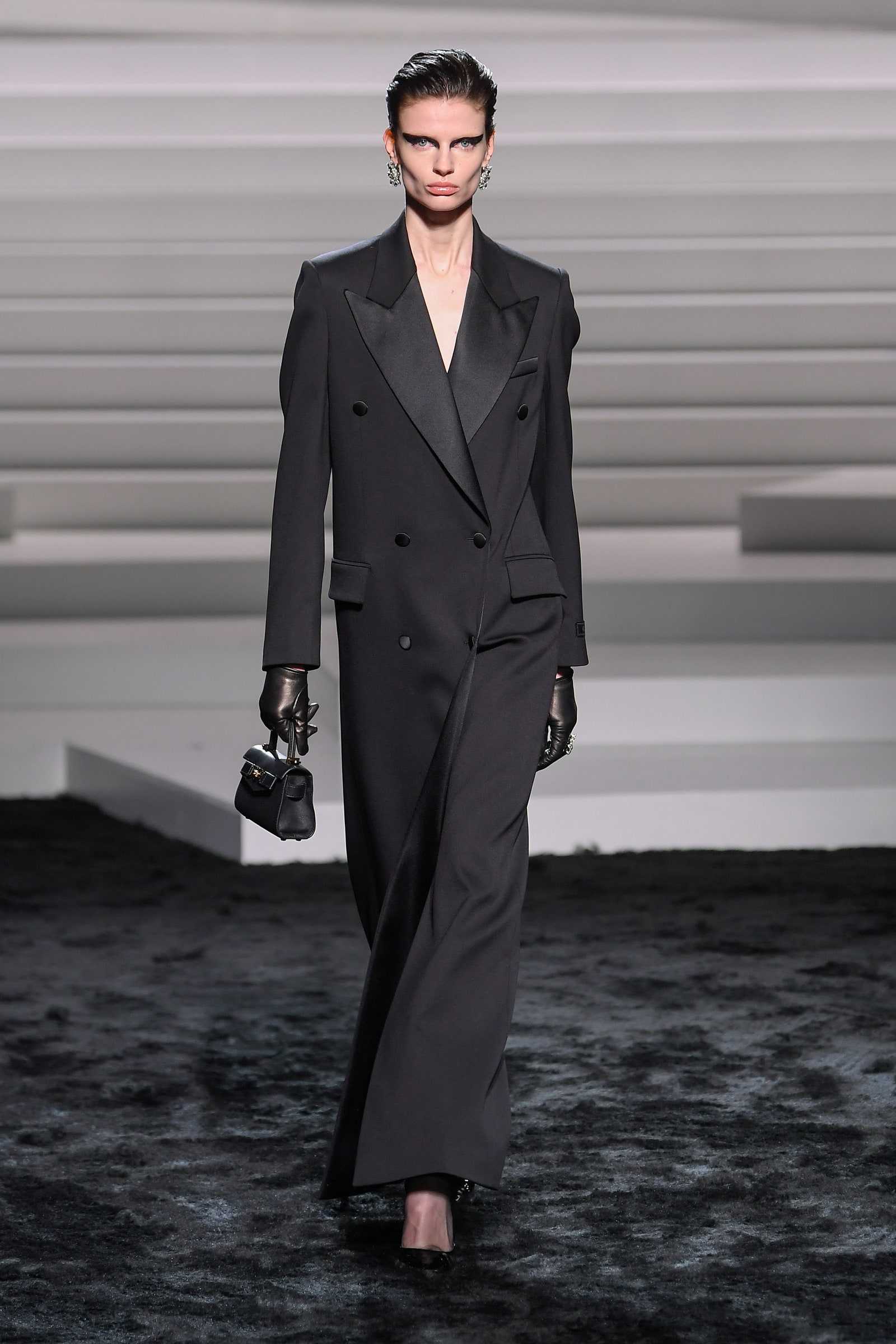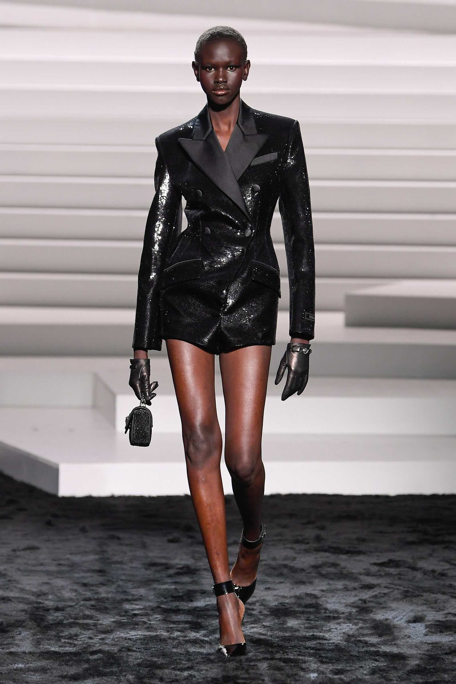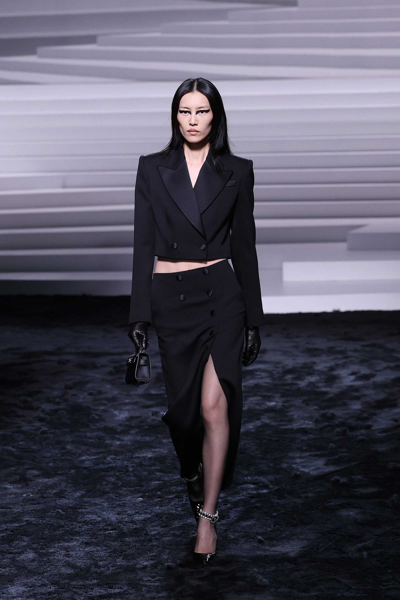 The show’s rebellious streak extended to the tailoring, which was downplayed with unexpected elements to shake off the formality. It was all about contrasts, and saw extra-long coats rub shoulders with blazer dresses with extra-short hemlines that were covered in glittering sequins. The looks were deconstructed, and injected with an extra dose of sexiness. Case in point? A midriff-baring silhouette that appeared to have been cut at the middle, which was composed of a short tuxedo jacket and a long skirt with a slit.