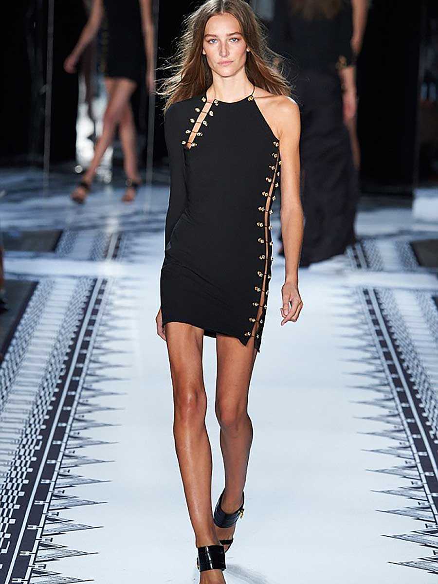 - 1994 — культовое платье с разрезами и булавками на актрисе Элизабет Херли.