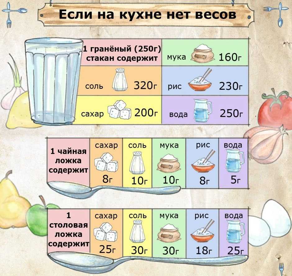 Чтобы узнать, сколько грамм соли или воды в стакане, а также подсчитать вес других пищевых продуктов, придерживаются следующих рекомендаций: