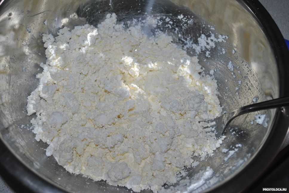 Тщательно перемешиваем смесь до однородной массы. Добавляем сахар и снова перемешиваем (по желанию также можно добавить в творог немного изюма).