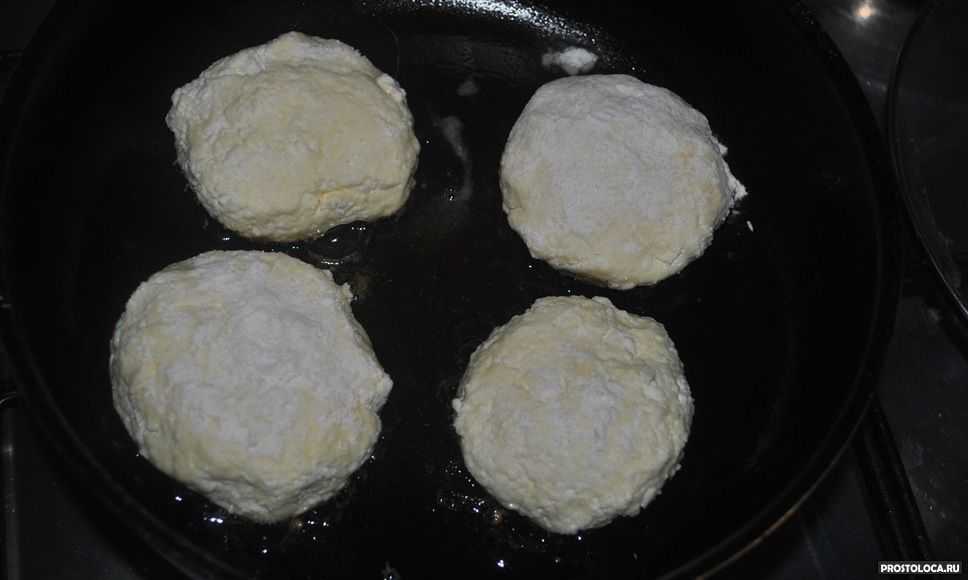 Ставим сковороду разогреваться на огонь. Льем растительное масло. Когда она как следует разогреется, выкладываем наши лепешки так, чтобы они не соприкасались и их было легко переворачивать. Жарить сырники следует на слабом огне с двух сторон в течение 15 минут, чтобы они как следует пропеклись.