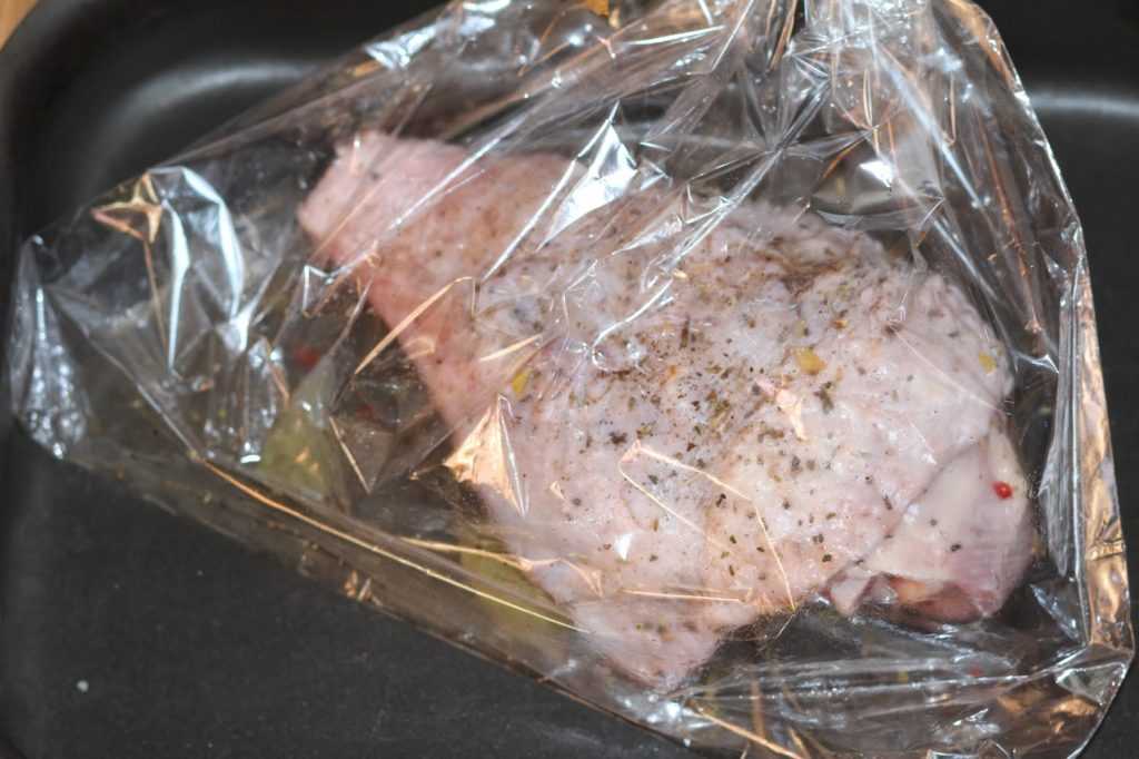 Важно, чтобы маринад полностью покрывал индейку, так что при необходимости можно добавить воды. Мясо стоит поставить в холодильник на 60 мин., чтобы оно пропиталось солью.