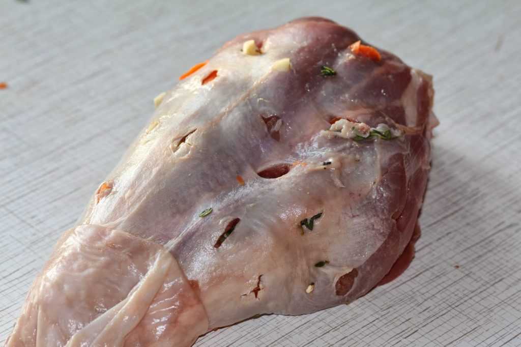 - Делаем глубокие проколы вдоль кости с помощью длинного ножа. Шпигуем чесноком — вкладываем в надрезы дольки чеснока, нарезанные тонкими пластинками.