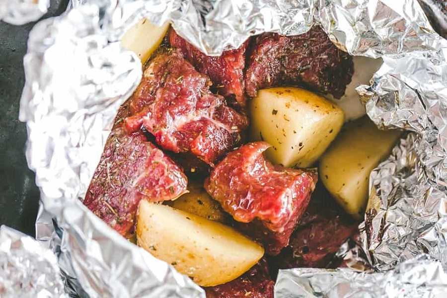 В фольге с картофелем можно запекать разные части туши говядины, будь то вырезка, лопатка, грудина или ребрышки