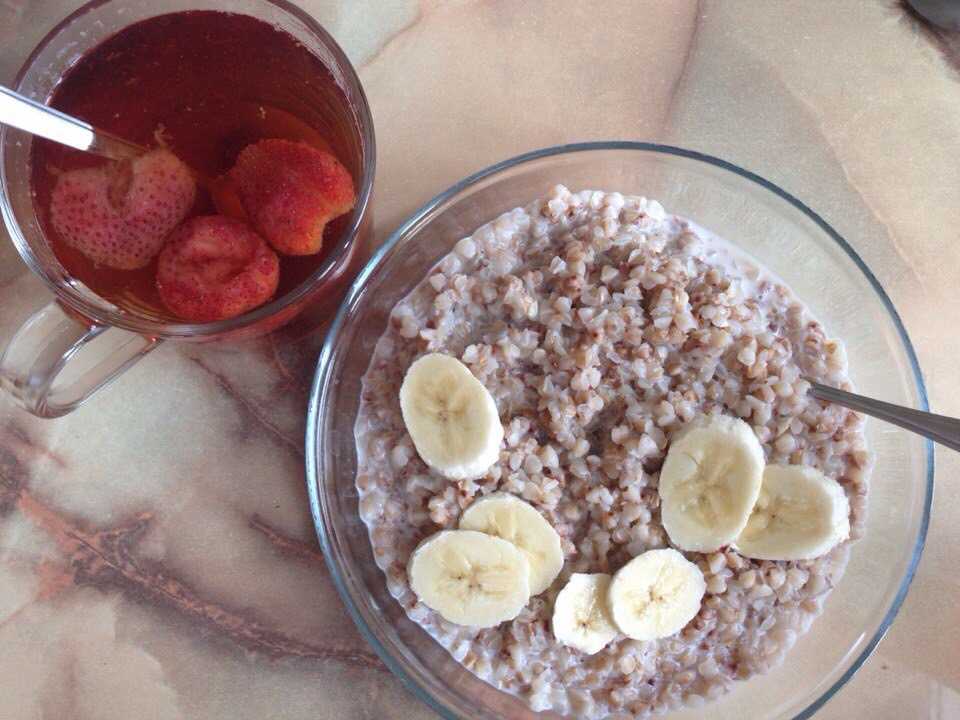 Каша из гречневой крупы плохо сочетается практически со всеми фруктами и ягодами. Но есть вкусное сладкое исключение – бананы. Они хорошо дополняют крупу и позволяют ей превратиться в полезный диетический десерт. Ингредиенты: пол-литра жирного молока, 90 г крупы, 1-1,5 большие ложки белого сахара, соль на кончике ложки, крупный мягкий банан.