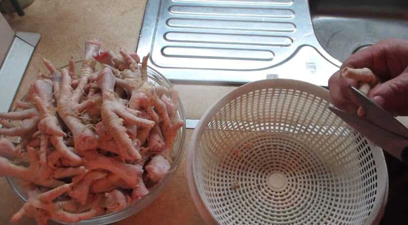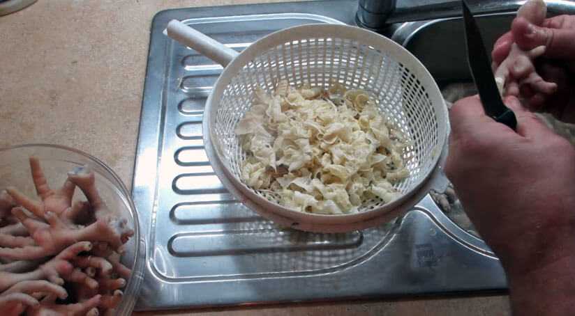 2. После удаления коготков нужно снять грубую верхнюю кожу с каждой лапки. Для этого нужно залить все лапки кипятком, подержать в нем пару минут, после чего кожа снимается легко, словно чулок. При этом следует быть внимательным, чтобы не оставить куски грубой кожи на какой-нибудь из лапок.