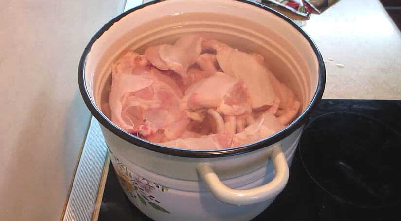 3. Очищенные лапки, грудки и спинки хорошо промойте и поместите в кастрюлю для варки холодца. Залейте кастрюлю водой и доведите до кипения.