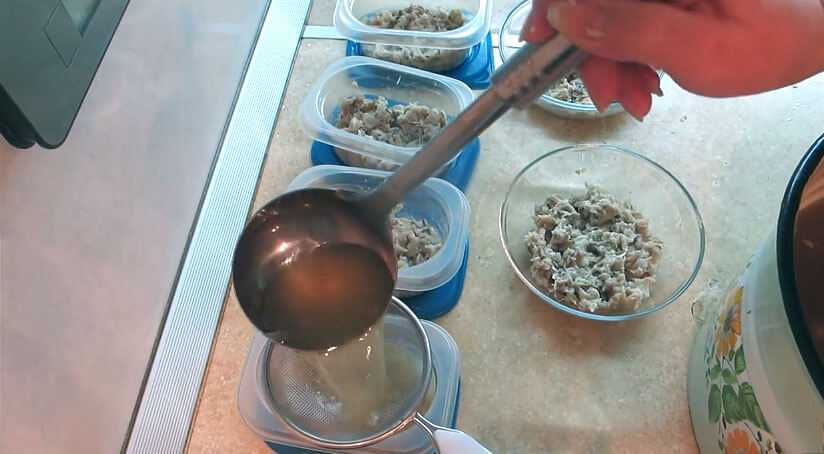 - Бульон процеживается и используется для заливки мясных составляющих.