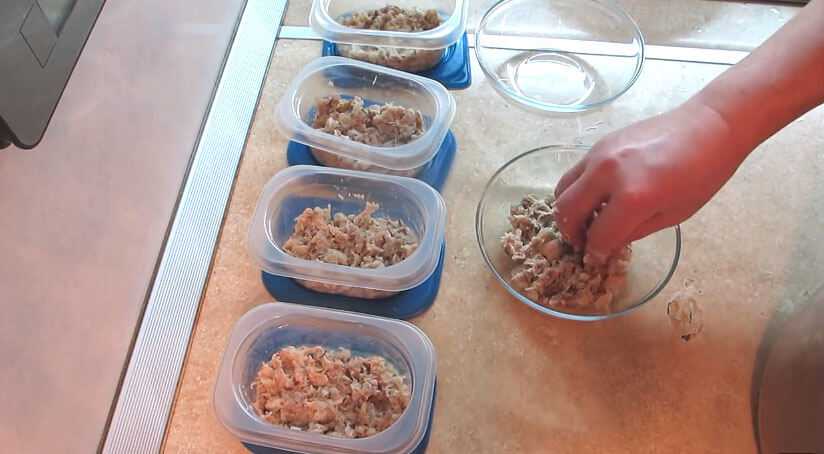 - Через час мясо извлекается и делится на волокна, которые распределяются по судкам.