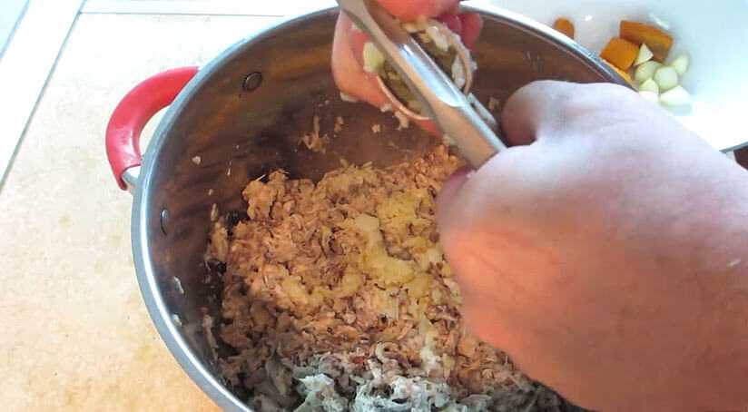 - Пока готовится мясо, очистите чеснок и пропустите его через пресс. Чеснок нужно добавить в бульон примерно за 5-10 минут до окончания варки.