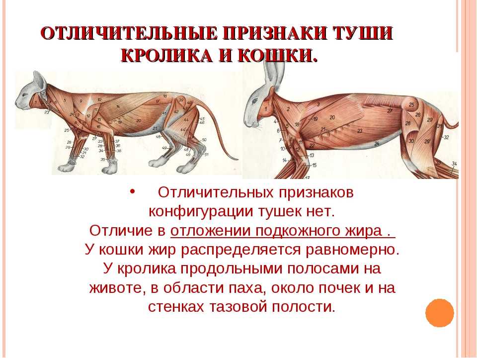 Жировая прослойка довольно тонкая, за счет чего мясо получает мраморный оттенок. В случае с кошкой жировая ткань откладывается на стенке брюшины. Кроме того, у жирной кошки печенка голубовато-красного цвета.