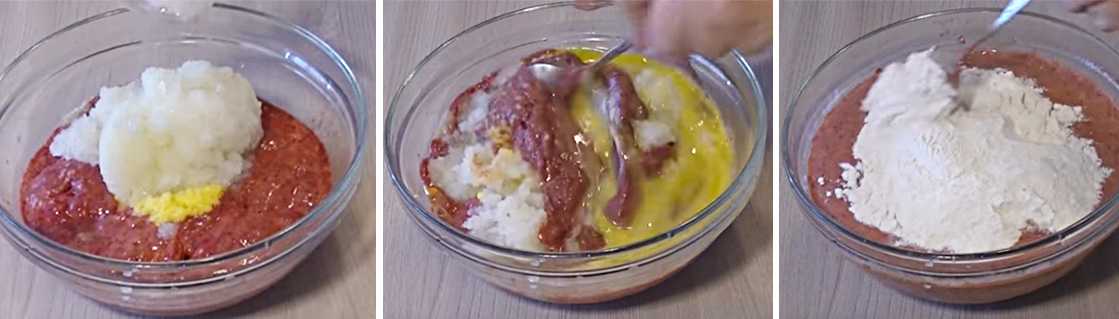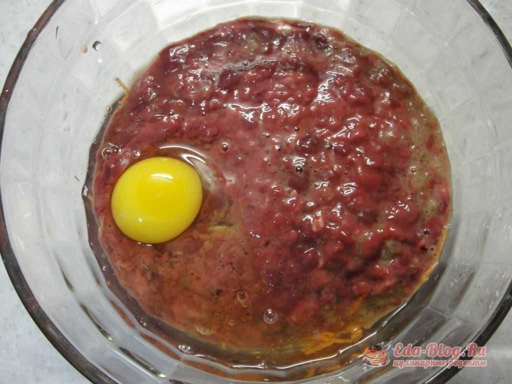 Добавляем соль, перец, яйца, сметану и, одну тертую и отжатую от сока луковицу
