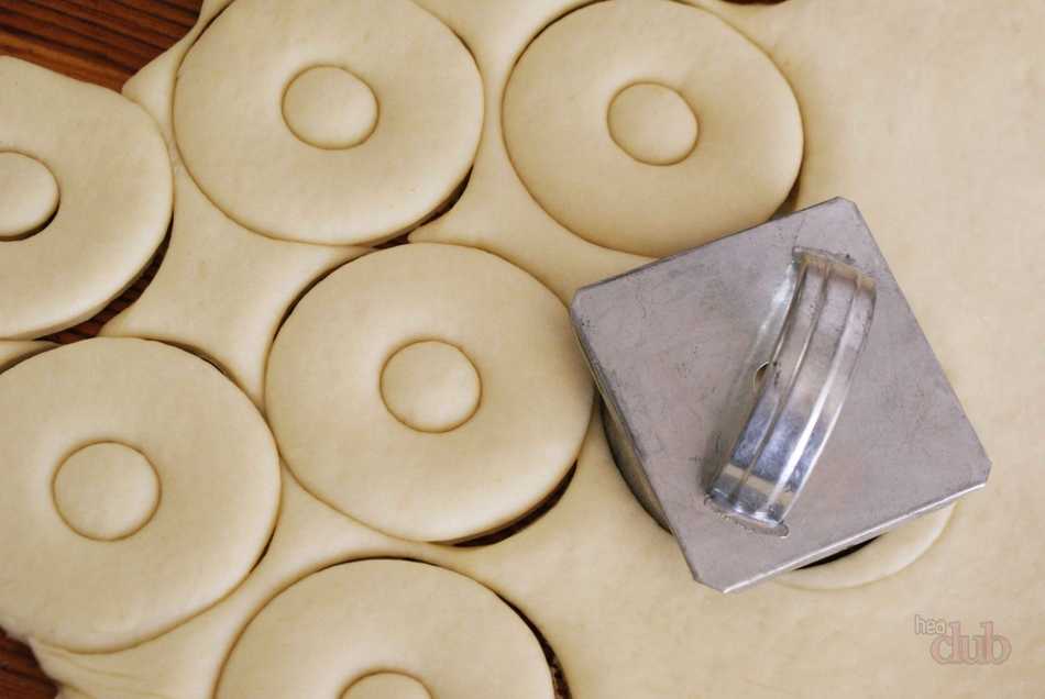 После подъема тесто требуется обмять и раскатать в пласт толщиной 2-2,5 см. При помощи стакана вырезать круги. На этом можно остановиться, если вы будете готовить пончики с начинкой (сгущенкой, повидлом, творогом). На один круг нужно положить немного начинки, прикрыть вторым и тщательно защипать края.Я решила делать пончики без начинки, с дырочкой – донатсы. Отверстие по центру можно проделать насадкой для кондитерского мешка или крышкой от пластиковой бутылки. Дать заготовкам немного подойти (10-20 минут), накрыв пищевой пленкой, чтобы поверхность не обветривалась.
