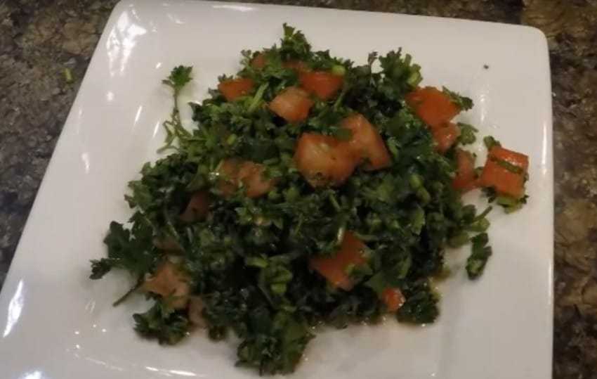 Выращенные на даче помидоры делают салат очень сочным и заставляют вкус играть новыми красками. Кинза, петрушка и оливковое масло подчеркивают вкус и делают блюдо немного похожим на греческий салат.