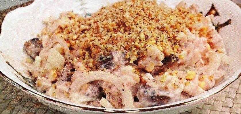 Рецепт салата «Сказка» с курицей, шампиньонами и грецкими орехами