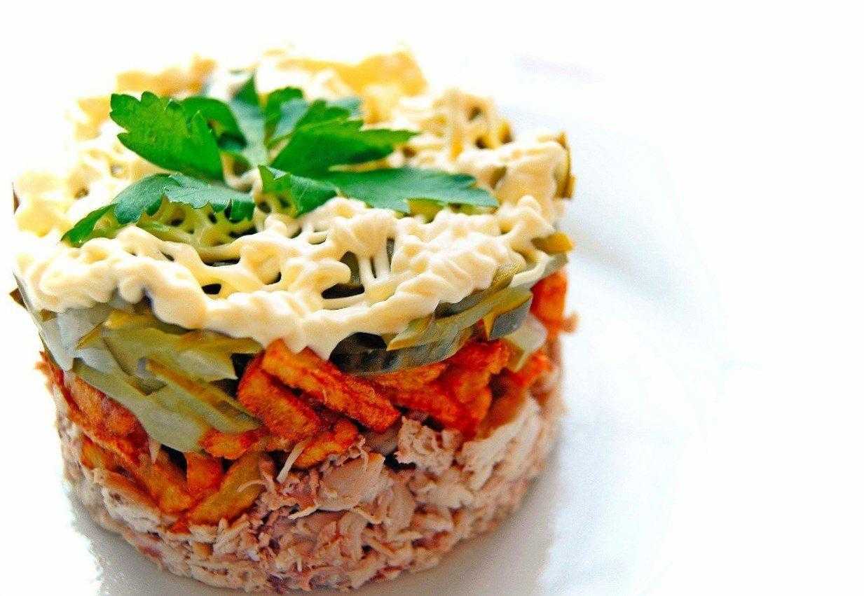 Выглядит закуска презентабельно, необычно и радует не только внешним видом, но и вкусовым разнообразием. Пикантность придают маринованные огурчики и консервированные грибы, а в сочетании с картошкой — пальчики оближешь.