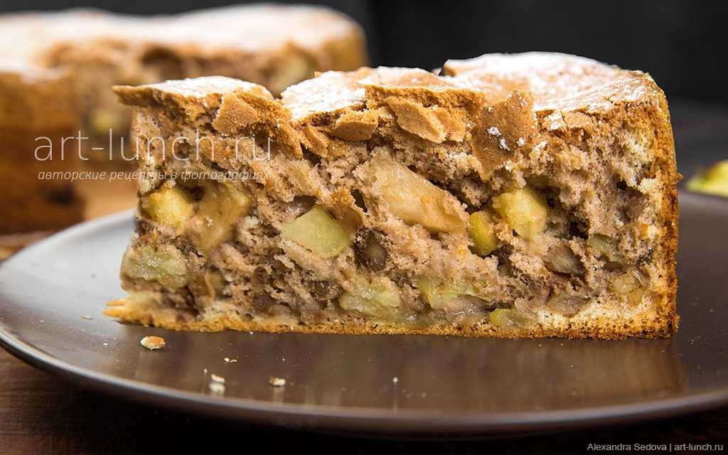 Наша шарлотка готова! Можно перед подачей посыпать её сахарной пудрой. Посмотрите, какая чудесная хрустящая корочка, нежный воздушный бисквит и, конечно, яблоки. И орехи с корицей здесь правда очень кстати. Надеюсь, вам понравится. Приятного аппетита!