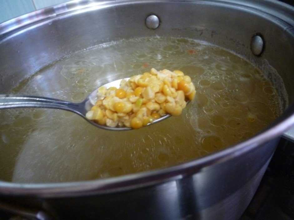 - Горошек аккуратно промываем под проточной водой и добавляем к бульончику.