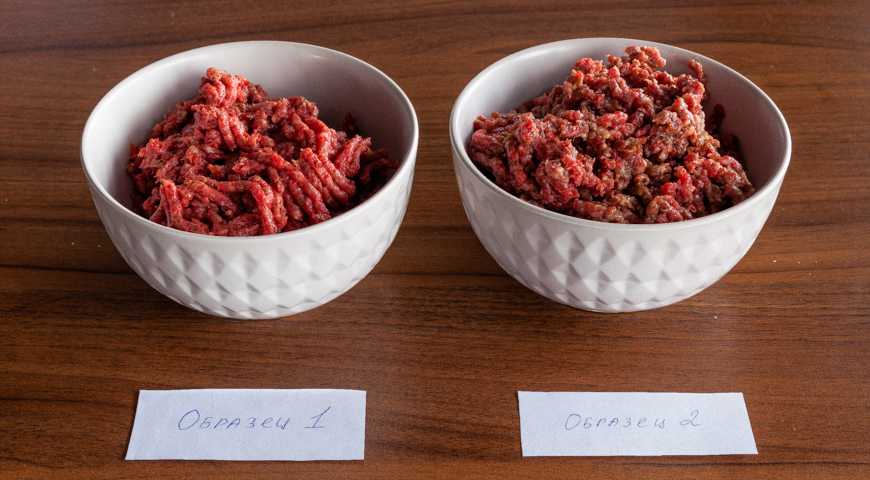 Фарш из солёного мяса, образец 1 (слева) и фарш без соли, образец 2 (справа)