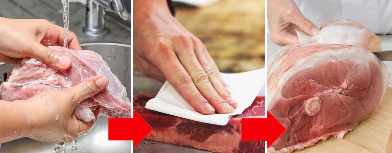 Кусок мяса моют, обсушивают бумажным полотенцем, если есть – отделяют шкуру и часть сала.