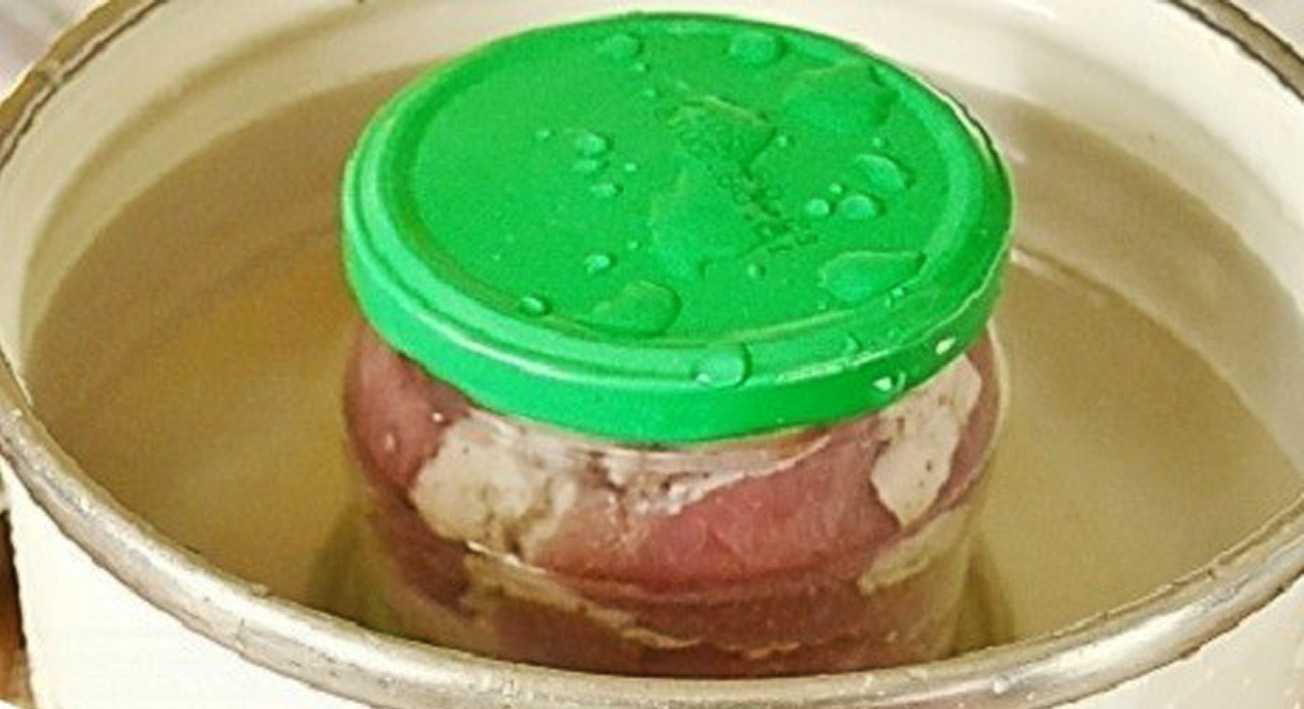 Кастрюлю с банками ставят на плиту, добавляют в нее холодную воду так, чтобы она покрывала банки «по плечики». Каждую банку прикрывают крышками не завинчивая. Воду доводят до кипения, затем убавляют огонь так, чтобы вода лишь булькала, но не интенсивно кипела. Сверху кастрюлю накрывают крышкой и оставляют томиться тушенку на 5.5-6 ч.