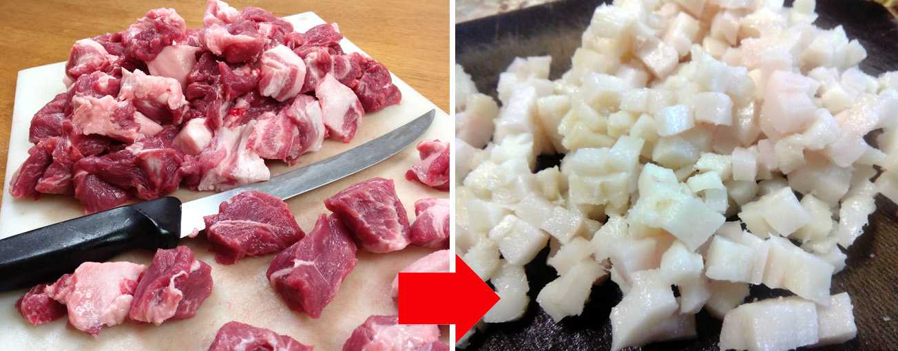 Количество сала нужно регулировать исходя из того, насколько жирный кусок свинины. Если он совершенно постный, то количество сала прибавляют (до 150-200 г), если нет – можно срезать его непосредственно с куска мяса и вытопить.