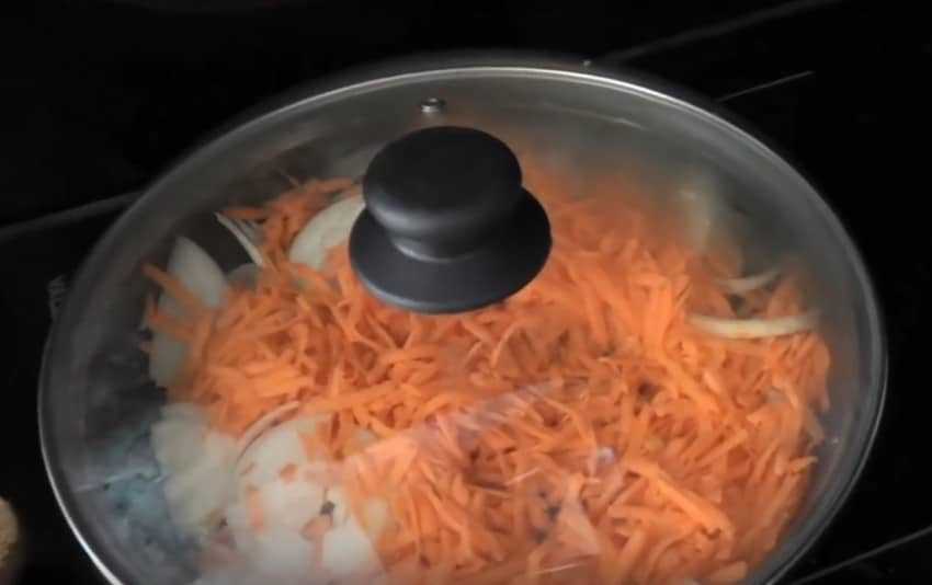 Когда он станет прозрачным можно добавлять морковку. Когда овощи приготовятся, а именно: станут золотистыми, можно снимать их с огня и откладывать в отдельную тарелку.