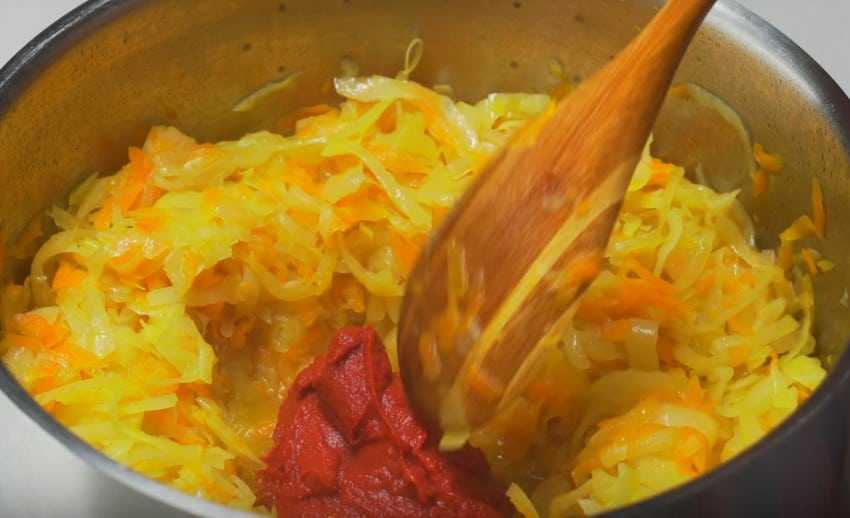 На их месте должен оказаться лук и морковь – тоже для обжарки. Затем к ним присоединяют капусту, наливают воду. Когда блюдо будет наполовину готово, в него надо добавить картофель и специи. Также нужно влить томатную пасту, разведенную водой. Все ингредиенты перемешивают и тушат до готовности.