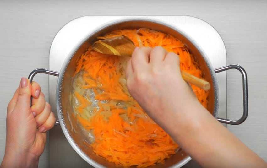 Пока тушится лук, очищаем и трем крупной теркой морковь. Ее отправляем в состав, готовим еще примерно 4 минуты, до размягчения.